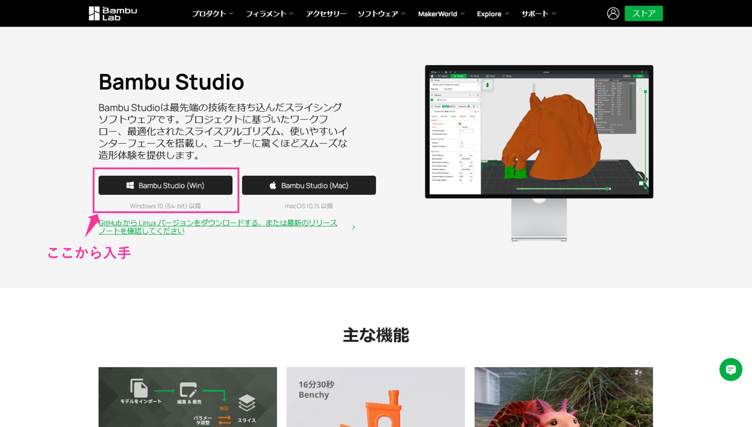 Bambu StudioはBambu Labの公式ページから入手することができます。