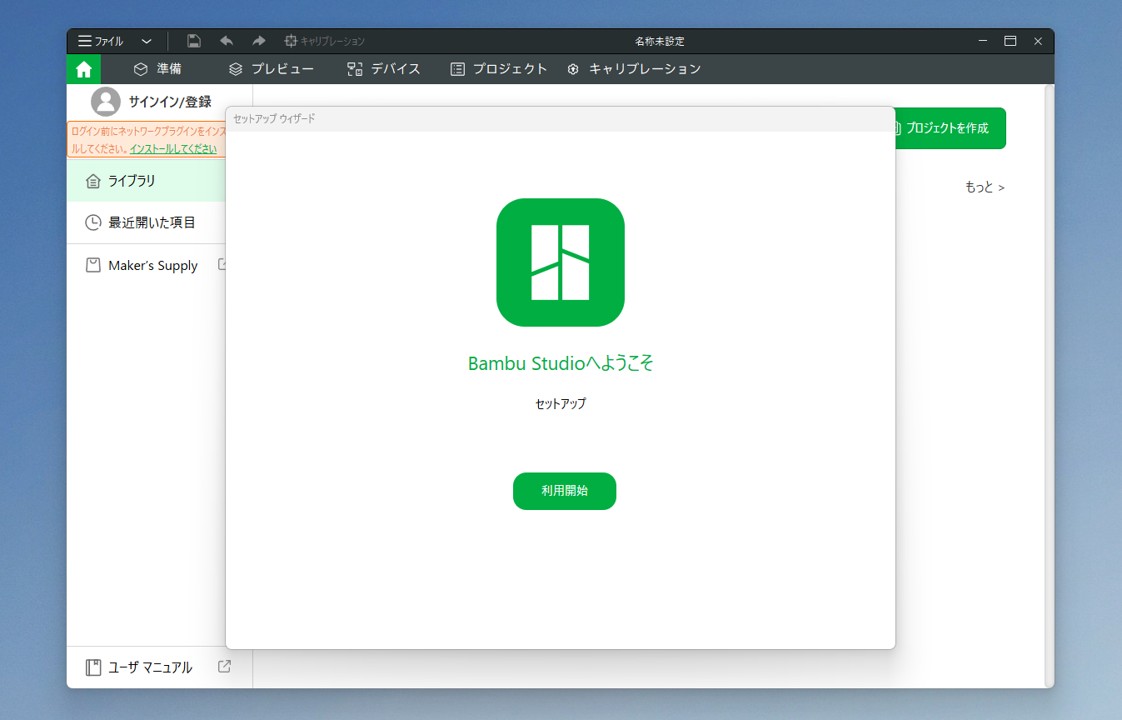Run Bambu Studioにチェックを押してCloseしたので、インストーラーが終了た後、ソフトが立ち上がります。スプラッシュ画面の表示、色々読み込んだ後に、ようこそ画面が表示されました。